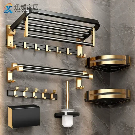 Accesorios de baño de aluminio negro y dorado, juego de Hardware, barra de toalla, soporte de papel, gancho para bata, estante de baño, colgador, cepillo de baño