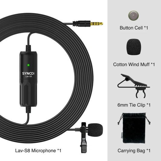SYNCO Lav-S8 Professional Lavalier Microphone Clip-on Omnidirectional Lapel Mic Noise Reduction Auto-Pairing 8M/ 26.2ft Cable