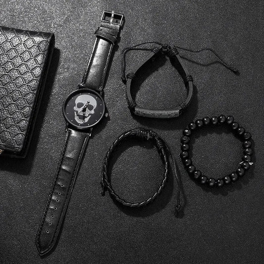 4Pcs Mens Black Watches Skull Pattern Dial Design Luxury Leather Band Quartz Wristwatch Outdoor Casual Sports Watch Relogio