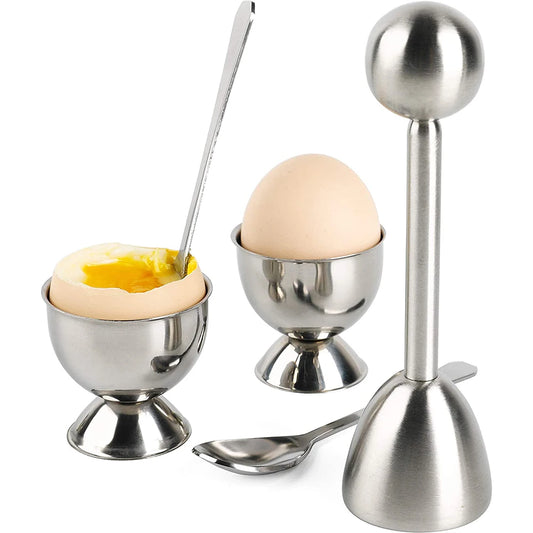 LMETJMA Egg Cracker Topper Set Stainless Steel Soft Hard Boiled Eggs Separator Holder with Spoons Kitchen Egg Tools KC1013