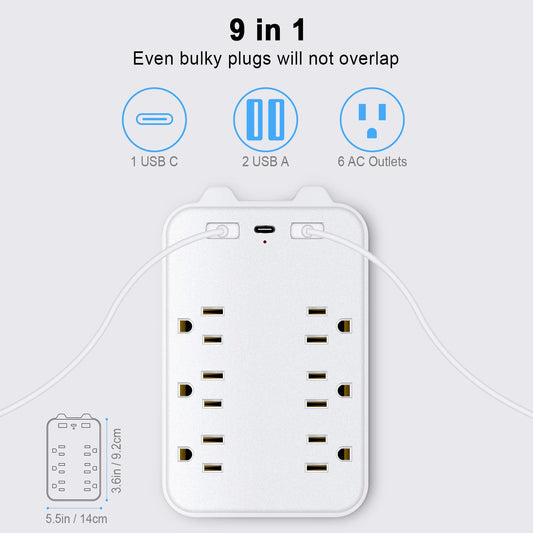 9-in-1 Surge Protector 6-Outlet Extender with 2 USB & 1 USB-C Ports Power Strip Multi Plug Outlets Wall Adapter Spaced for Home