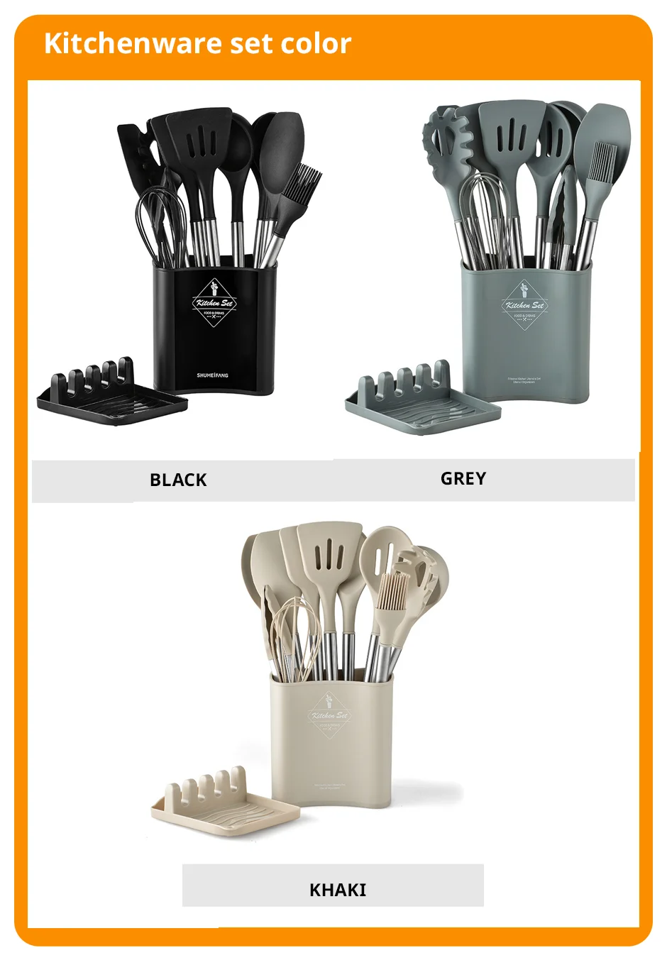 13 PCS Silicone Kitchen Utensil Set Stainless Steel Handle Kitchen Cooking Baking Tools Kitchenware Accessories Storage Bucket