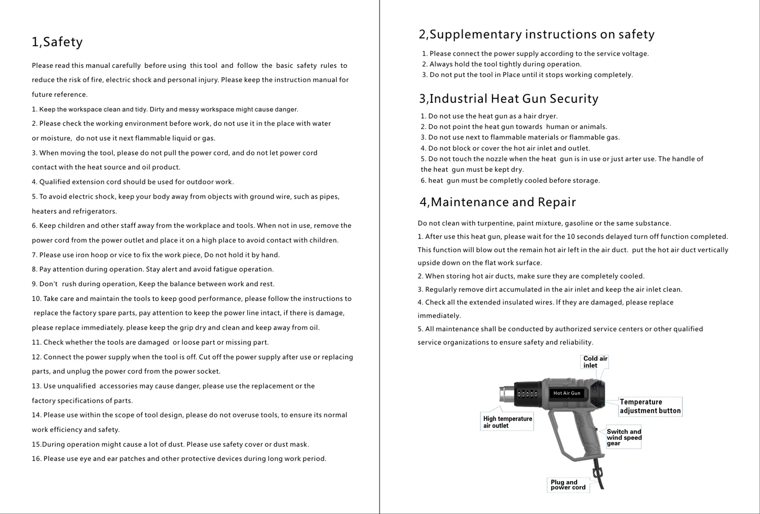 ③ The handle of the hot air gun must be kept dry, clean and away from oil or gas.