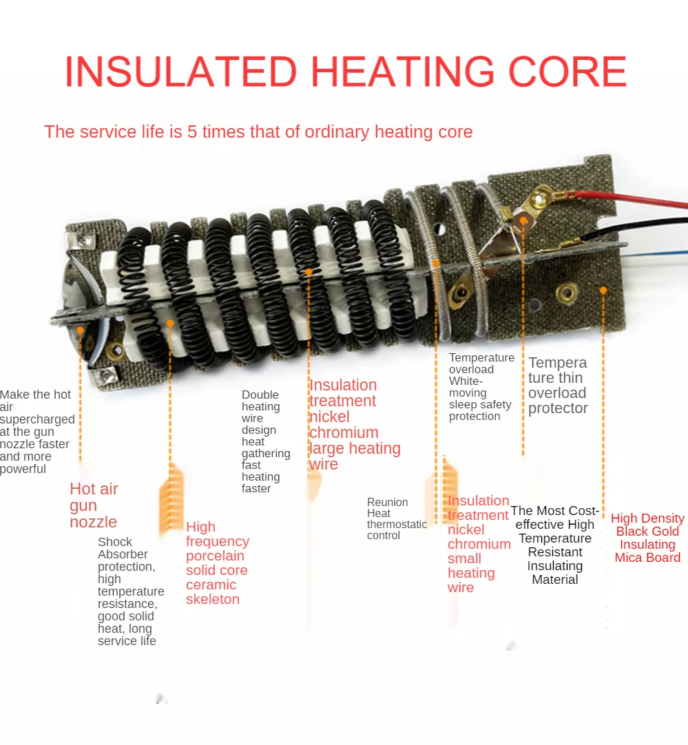 Heating core: Gold mica plate + insulated heating core + jump switch + ceramic framework