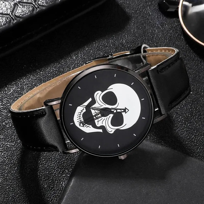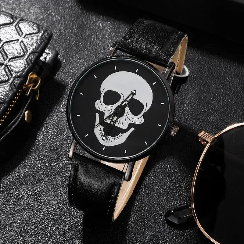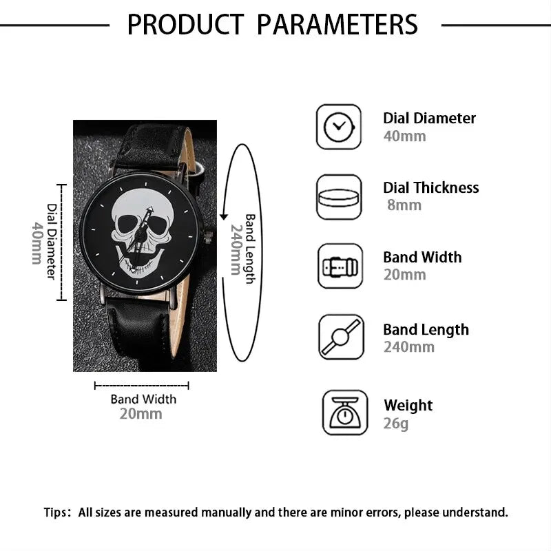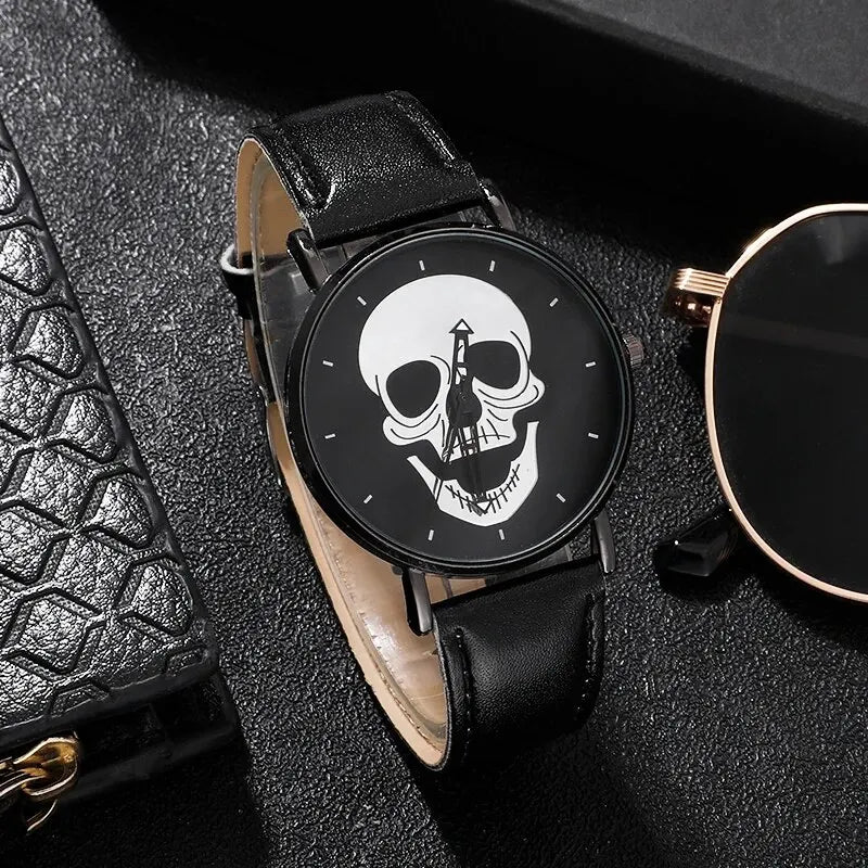 4Pcs Mens Black Watches Skull Pattern Dial Design Luxury Leather Band Quartz Wristwatch Outdoor Casual Sports Watch Relogio