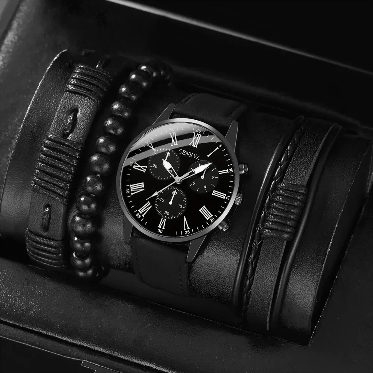 This 4-piece quartz watch set is an essential accessory for the business casual man. With a round pointer calendar design, these watches offer both fashion and function. Made with high-quality materials, these watches are durable and stylish. Elevate your accessory game with this set!