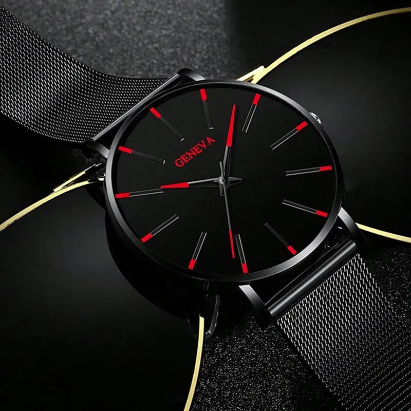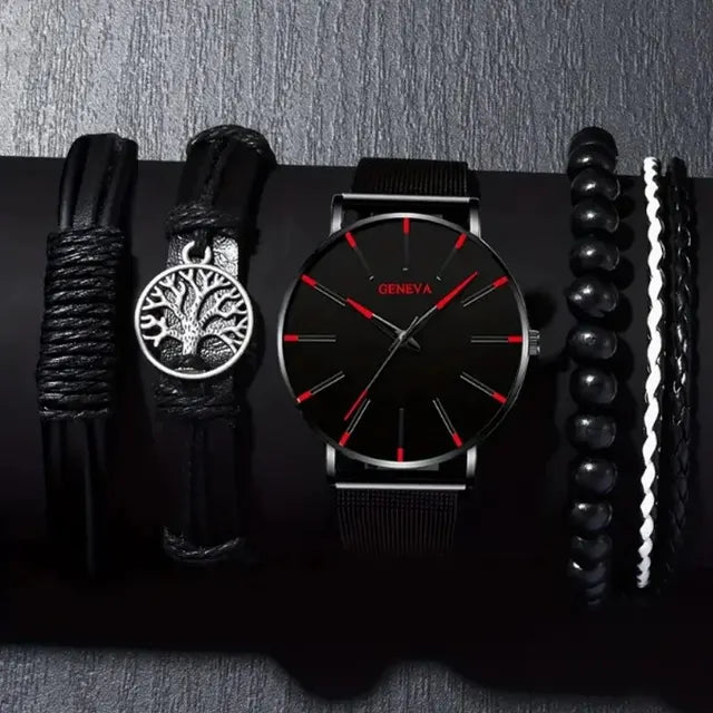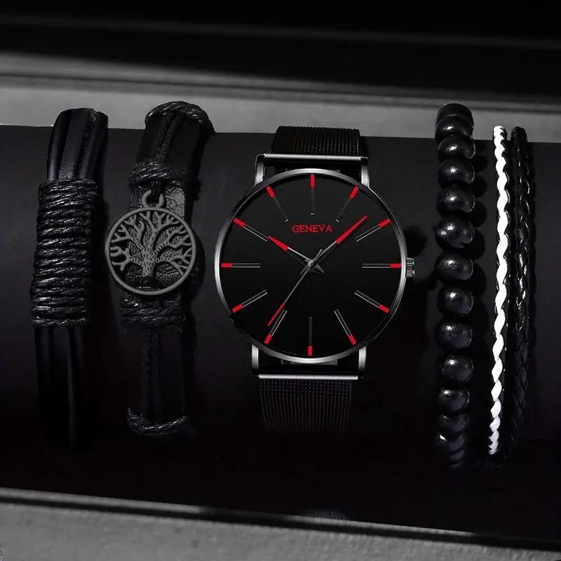 5pcs Luxury Black Stainless Steel Mesh Belt Quartz Watch With Bracelet For Men Casual Fashion Round Watch In Daily Sport Watches