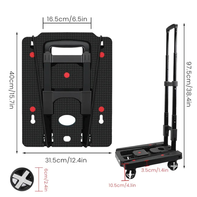 AIRAJ 4 Rounds Folding Hand Truck Black Small Lightweight Cart Portable Telescopic Dolly Backpack Luggage Travel Moving Shopping