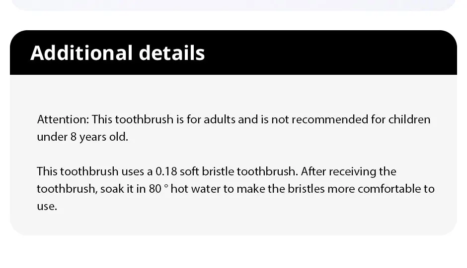 • Fine Hair :The toothbrush's fine hair bristles can reach hard-to-reach areas in the mouth, making it ideal for people with crooked teeth or dental work.