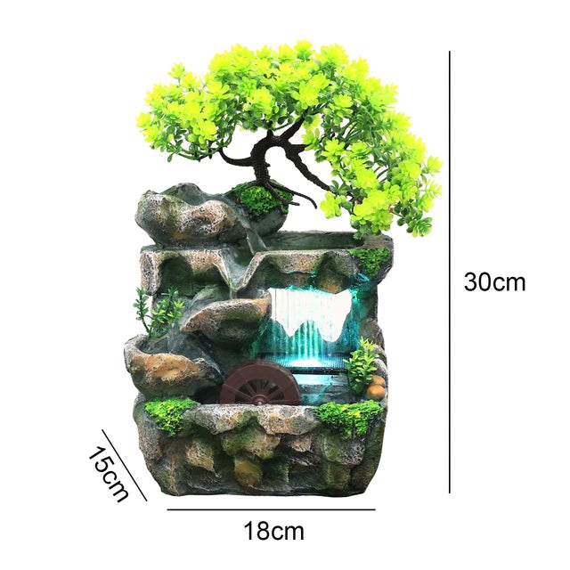 【Simulation Waterfall Statue】Mini Indoor Illuminated Waterfall Fengshui Ornament with simulated landscape design, artificial trees, rockeries and flowing water through the fountains, and will bring peace to your life