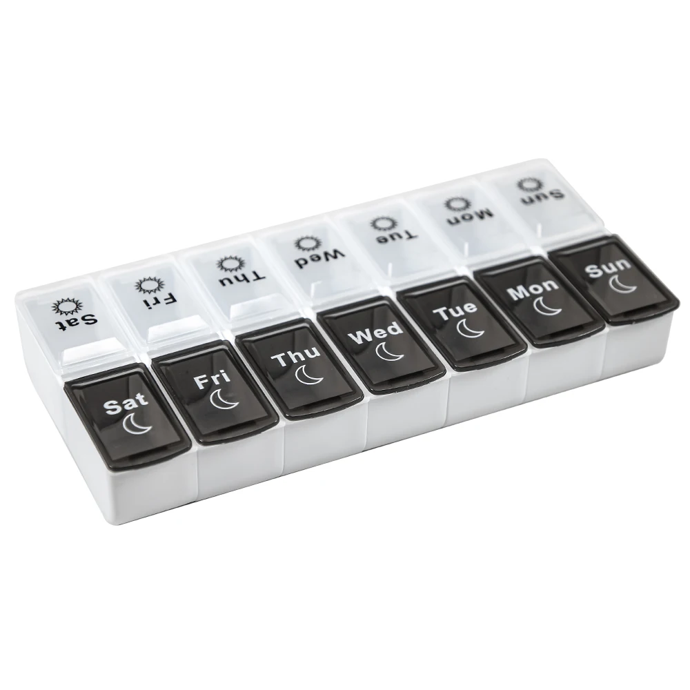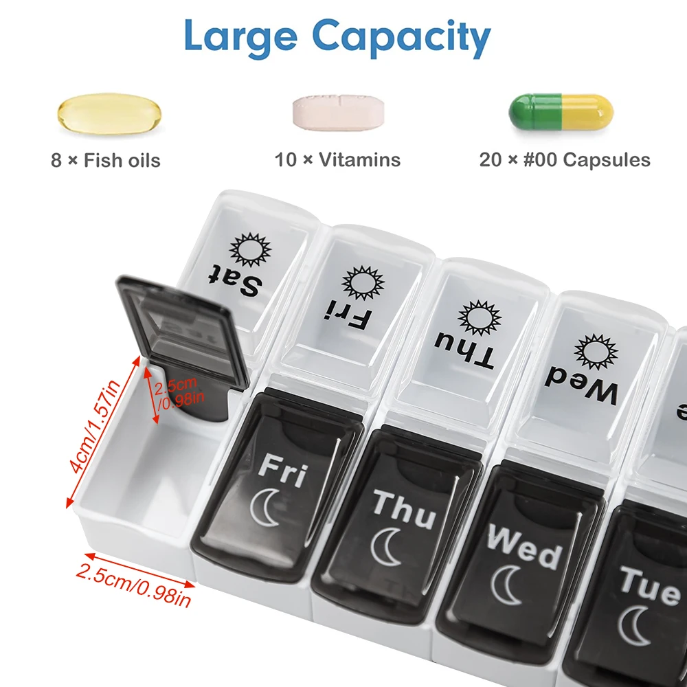 -- 14 separate compartment for your weekly twice a day tablet usage.