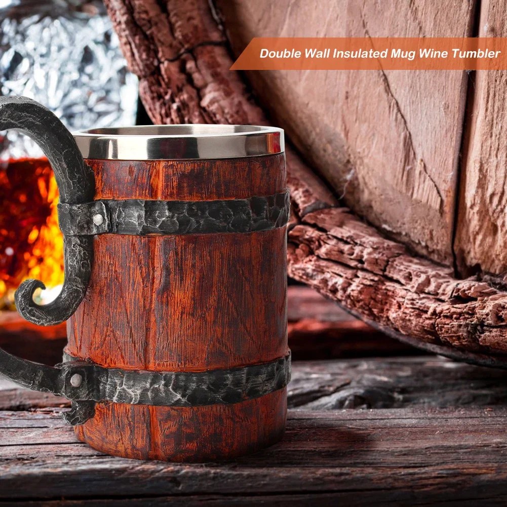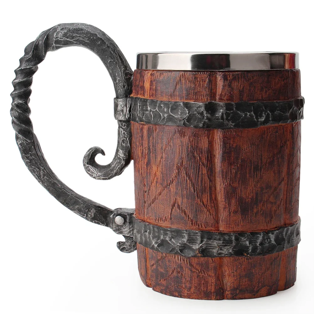 Wooden Barrel Beer Cup Stainless Steel Beer Mug Double Wall Drinking Cups Viking Style Vintage Coffee Mugs Kitchen Supplies