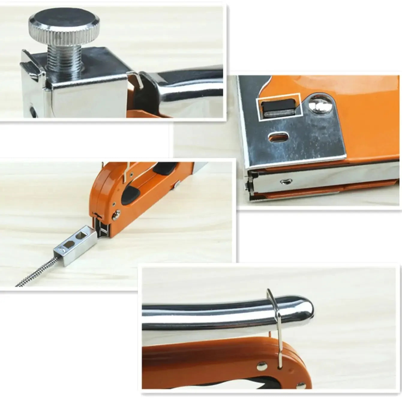 - Fácil de instalar y usar: las pistolas de grapas manuales están hechas de acero al carbono grueso, adoptando el principio de impacto de resorte y durabilidad duradera.
