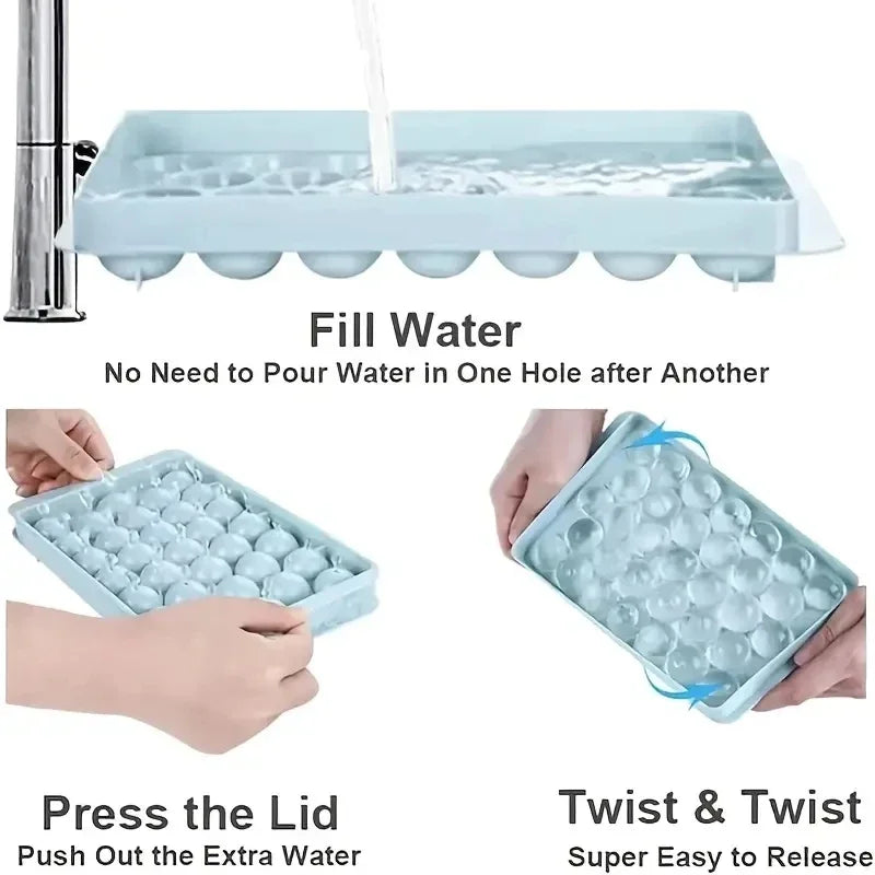 Caja de hielo de bola redonda de plástico, 33 rejillas, bandeja de hielo redonda, molde, moldes para hacer bolas de hielo, bandeja de cubitos de hielo redonda 3D con tapa de plástico