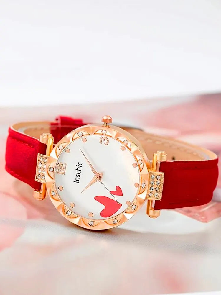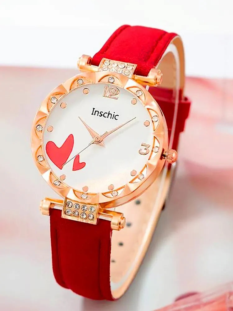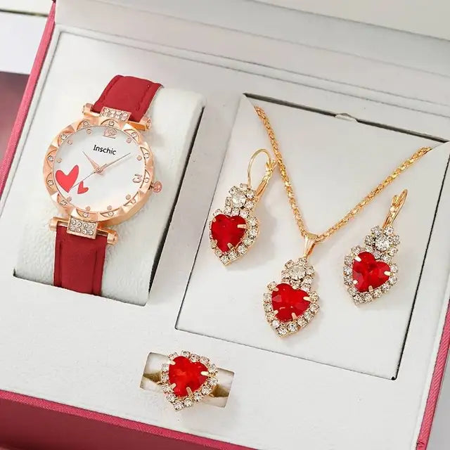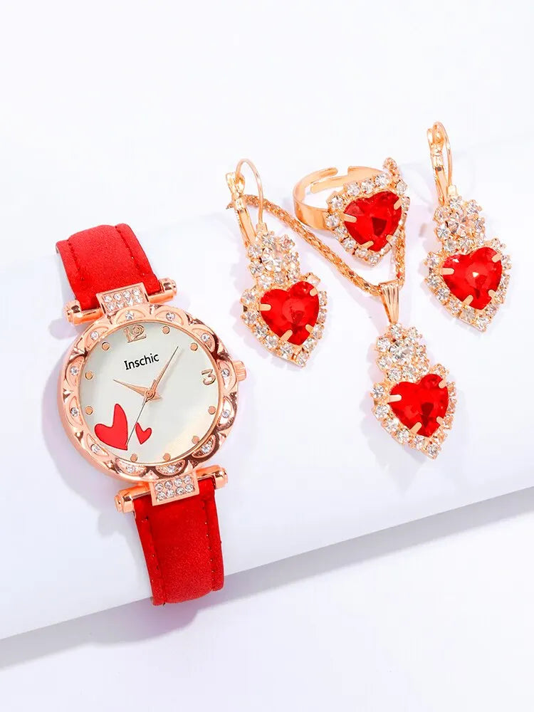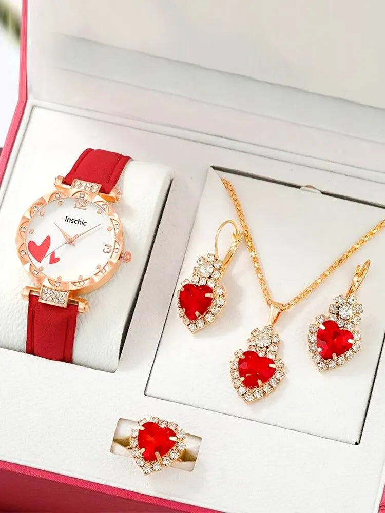 Juego de 5 uds de diamantes de amor a la moda, reloj de cuarzo con cinturón rojo para mujer, collar con colgante, pendientes y combinación de anillos, juego de regalo