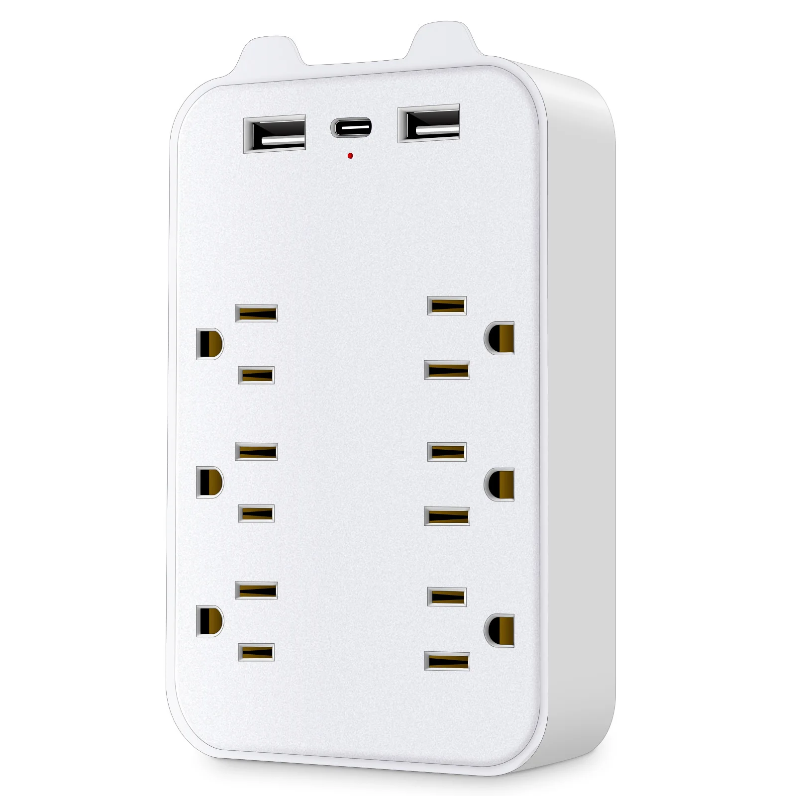 Protector contra sobretensiones 9 en 1, extensor de 6 salidas con 2 puertos USB y 1 USB-C, regleta de enchufes múltiples, adaptador de pared espaciado para el hogar
