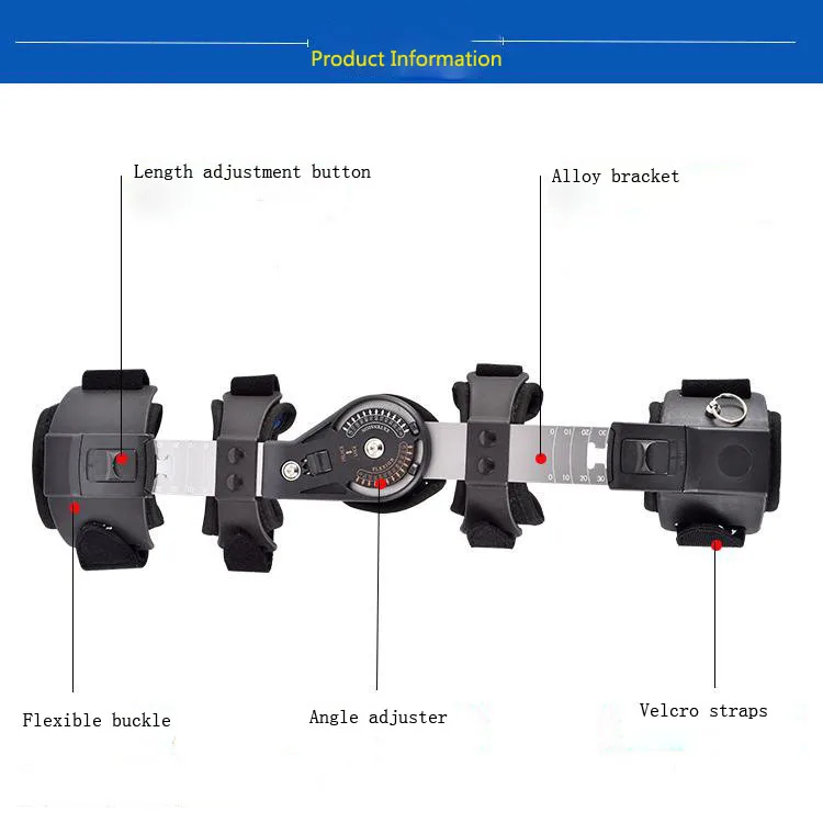 Estructura: El componente clave del aparato ortopédico es la estructura con bisagras, que consta de dos componentes en forma de placa de metal o plástico. Este diseño proporciona soporte elástico durante el movimiento del codo y ayuda a controlar y limitar el rango de movimiento, reduciendo el dolor y previniendo más lesiones.