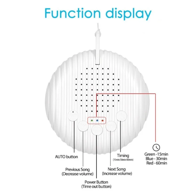 • Apagado de ruido: la máquina produce un ruido blanco suave que ayuda a apagar los ruidos externos, asegurando que su bebé duerma tranquilo.