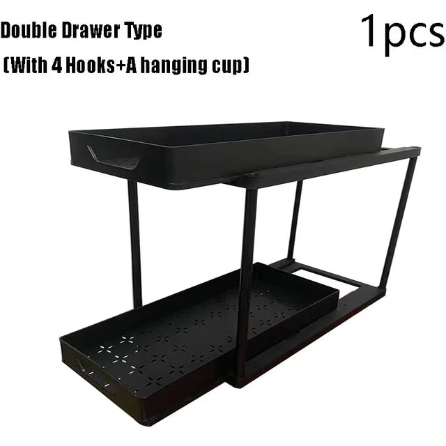 Este organizador debajo del fregadero está diseñado con una doble capa, maximizando el uso del espacio vertical. Viene con 4 ganchos laterales para colgar algunos artículos pequeños, aprovechando eficazmente el espacio limitado.