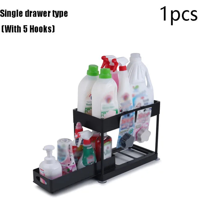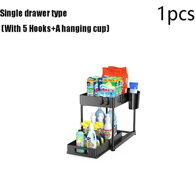 que es adecuado para la mayoría de los gabinetes debajo del fregadero, utilizando efectivamente el espacio debajo del fregadero para almacenar artículos de limpieza, haciendo que sus artículos estén bien organizados y almacenados de manera ordenada. Di adiós al espacio desordenado.