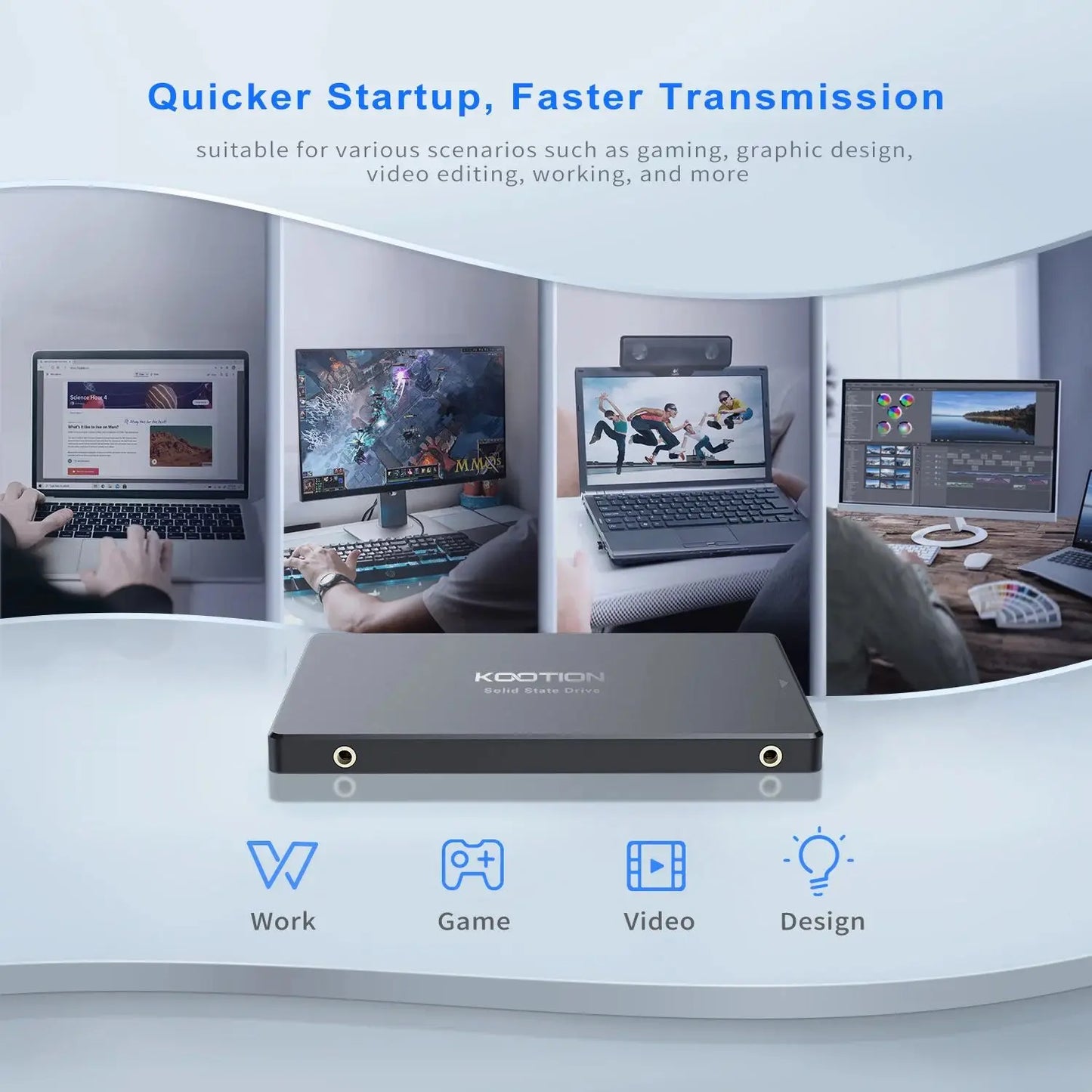 Acelere con la tecnología KOOTION 3D NAND para iniciar, cargar aplicaciones y juegos, y transferir archivos a una velocidad increíblemente rápida.