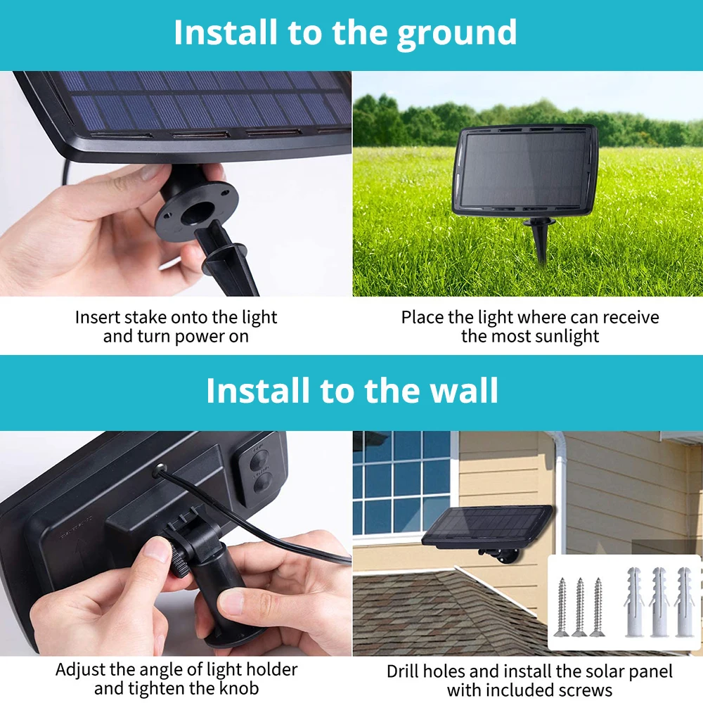 Longitud de la cadena de 12 LED: longitud total 6,1 M, la distancia entre el panel solar y la primera luz es 1,42 M, la distancia