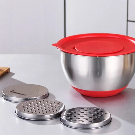Prepare comidas de manera experta con estos tazones para mezclar encajables de acero inoxidable. Completo con tapas herméticas, fondos antideslizantes y 3 accesorios para ralladores, disfrute de la comodidad de preparar y almacenar alimentos fácilmente. Elaborados con acero inoxidable duradero, estos tazones son imprescindibles para cualquier cocina.