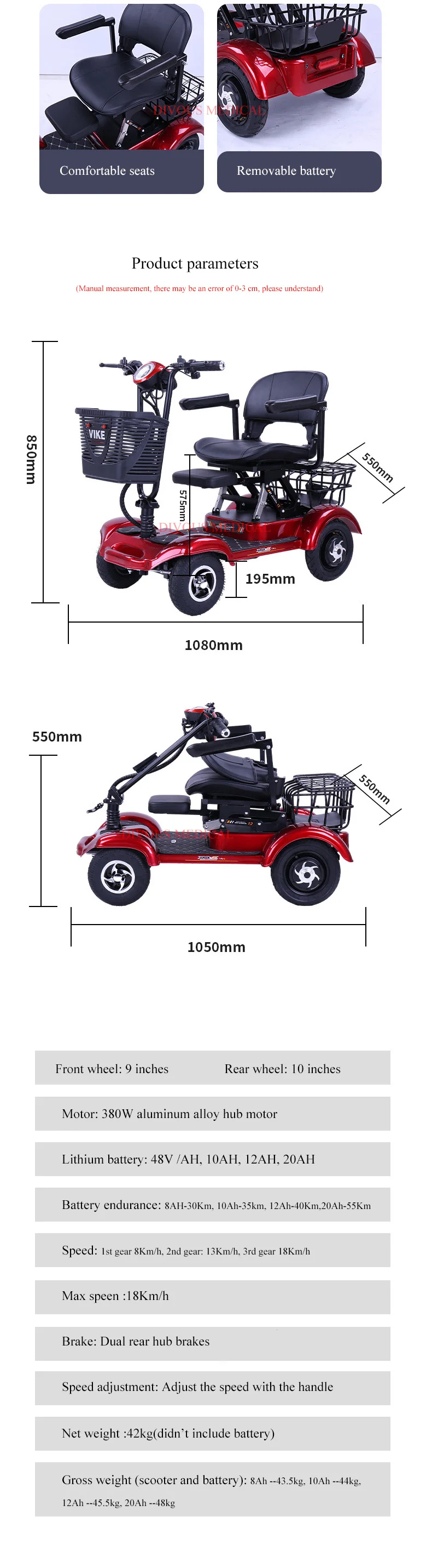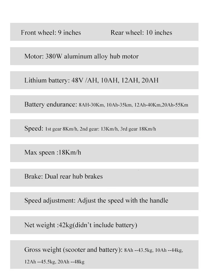 Peso bruto (scooter y batería): 8Ah --43,5kg.10Ah --44kg.12Ah--45,5kg.20Ah --48kg