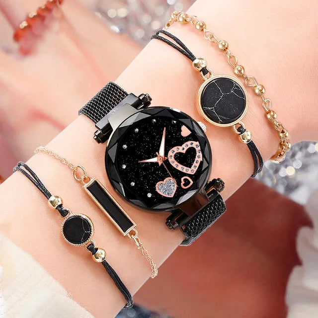5件装女士时尚星空爱心吸铁网带石英表+手链组合套装